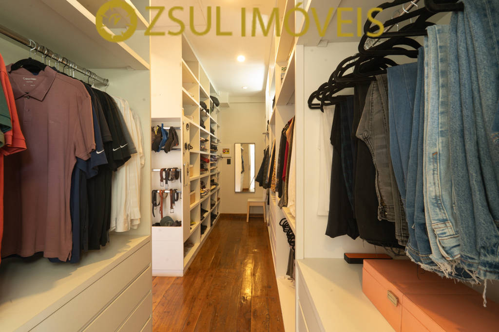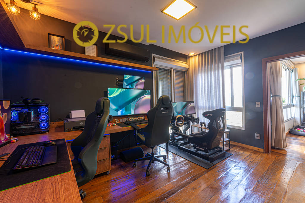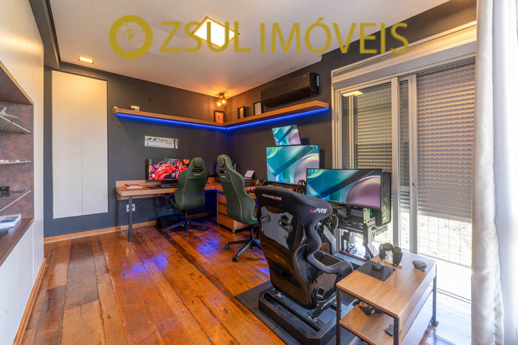 Pavimento Superior: Sala íntima, pequeno espaço para home office, ampla suíte com closet e banheira de hidromassagem, atualmente sendo usado como espaço para simuladores e escritório. Um segundo quarto com vista e banheiro na lateral.